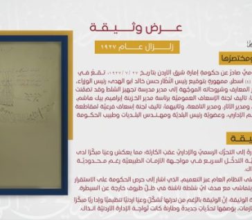 ينشرُ مركزُ التوثيقِ الملكيُّ الأردنيُّ الهاشميُّ وثيقةً رسميَّةً تعودُ إلى 27 تموز 1927