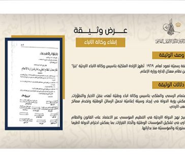 بمناسبة الذكرى ال ٥٦ لتأسيس وكالة الأنباء الأردنيَّة "بترا"، نشرَ مركزُ التوثيق الملكي الأردني الهاشمي وثيقةً تاريخيَّة تعود إلى ١٦ تموز عام 1969، وهو تاريخُ انطلاق الوكالة رسميًّا. الوثيقة المعنيَّة هي الصفحة ...