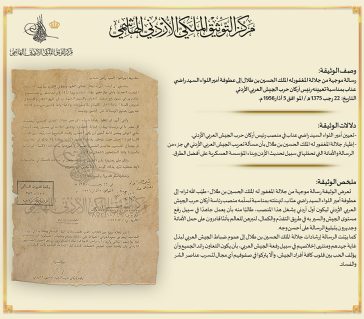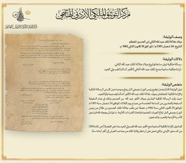 نشر مركز التوثيق الملكي بمناسبة عيد ميلاد جلالة الملك عبد الله الثاني ابن الحسين المعظم الحادي والستين، وثيقة تحمل توقيع رئيس الوزراء وصفي التل يبلغ بموجبه نصّ كل من الرسالة الملكية والإرادة ...