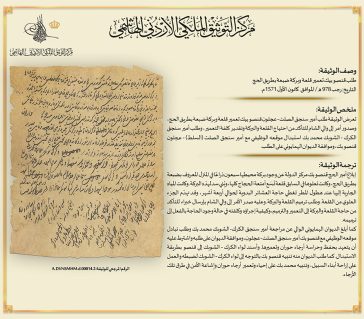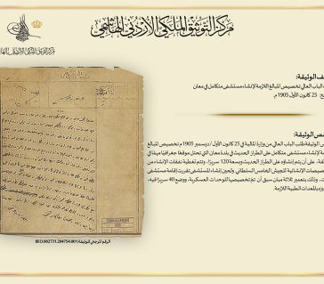 يعرض مركز التوثيق الملكي وثيقة باللغة العثمانية وهي من محفوظات الأرشيف التركي والمنشورة في كتاب " الأردن من خلال وثائق الأرشيف العثماني" الصادر عن مركز التوثيق الملكي الأردني الهاشمي وبالتعاون مع مركز ...