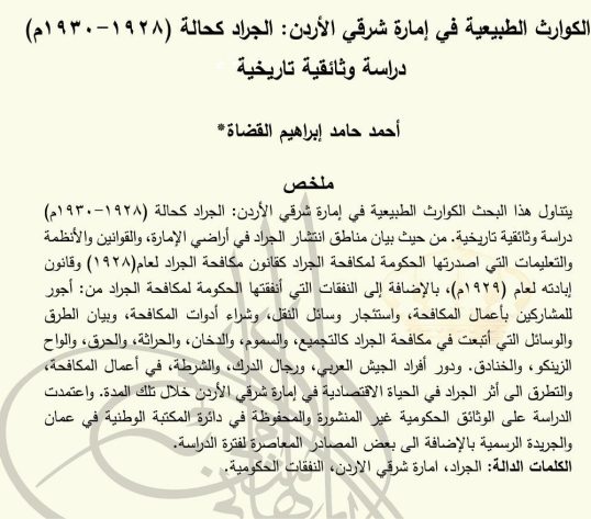 الكوارث الطبيعية في إمارة شرقي الأردن: الجراد كحالة (1928-1930م) / دراسة وثائقية تاريخية