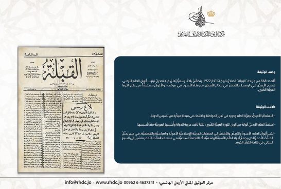 نشرَ مركزُ التوثيق الملكيُّ الأردنيُّ الهاشميُّ وثيقةً من أرشيفه تُظهِرُ العدد 568 من جريدة "القِبلة" الصادرة بتاريخ 13 آذار 1922، وَيَبرُزُ في هذا العدد البلاغُ الرسميُّ المتعلِّقُ بعلم الأردن، الذي يُوضِّحُ التعديلَ الذي طرأ على ترتيب ألوان العلم؛ فقد أصدرَ سُمُوُّ الأمير عبدِالله الأوَّل إرادتَهُ الساميةَ بتعديل ترتيب الألوان، ليصبحَ الأبيضُ في الوسط، والأخضرُ محلَّ الأبيض، ويبقى الأسودُ في موقعه الأصلي. عِلمًا أنَّ العلمَ قد استمدَّ ألوانَهُ ورمزيَْتَهُ من ألوان علم الثورة العربيَّة الكُبرى.