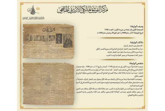 عرض مركز التوثيق الملكي الأردني الهاشمي بمناسبة عيد الفطر المبارك، وثيقة تتضمن الصفحتان الأولى والرابعة من العدد 1140 من جريدة الأردن الصادر بتاريخ 27 آب 1946 الذي يتضمّن مراسمَ الاحتفال بعيد الفطر المبارك؛ حيث تبدأُ بتأدية جلالة الملك صلاة العيد في الجامع الحسيني الكبير وتنتهي بتقبُّلِهِ التهاني في القصر الملكي، كما عرضت الصفحة الاولى صورًا لعدد من الملوك والرؤساء العرب، هم: جلالة الملك عبدالله الأول، والملك عبد العزيز آل سعود، والملك فاروق، وصاحب الجلالة الإمام يحيى، والأمير عبد الإله، والرئيس بشارة الخوري، والرئيس شكري القوتلي، وتضمَّنت افتتاحية العدد تهنئة جريدة الأردن للملك عبدالله الأول بحلول عيد الفطر المبارك، مُتَمَنِّيَةً أن يعيده عليه وعلى ملوك العرب وأمرائهم وهم يعملون لرفع مستوى العرب السياسي والاجتماعي إلى الذروة التي يرغبون فيها لهم.