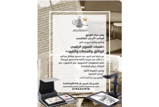يعلن مركز التوثيق الملكي الأردني الهاشمي وضمن برنامج تدريبي خاص " تقنيات التصوير الرقمي للوثائق والسجلات والقيود"، عن رغبته في التدريب المجاني لخمسة طلاب من خريجي (الهندسة بجميع فروعها، نظم المعلومات الحاسوبية، علم الحاسوب، علم البيانات، علم المكتبات)، وذلك ضمن الشروط التالية: -أن يكون أردني الجنسية. -أن يكون تقديره جيد جدًا كحد أدنى. على من يرغب في التقدّم ارسال معلوماته عبر الايميل training@rhdc.jo، أو التواصل مع الآنسة ريهام المصري على رقم 0796447978.