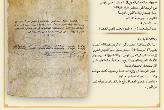 عرض مركز التوثيق الملكي الأردني الهاشمي، بمناسبة عيد الجيش الذي يصادف غدا الخميس وثيقة صادرة بتاريخ 17 أيار سنة 1944، تبيّن قرار مجلس الوزراء بتغيير اسم الجيش العربي إلى اسم "الجيش العربي الأردني". وقال المركز في تصريح صحفي اليوم الأربعاء إن تغيير المسمى جاء تمييزاً له عن جيوش الأقطار العربية المجاورة لذيوع سمعته وأعماله الطيبة لدى الأمم المتّحدة والدول الحليفة وغيرها.