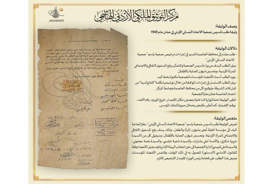 عرض مركز التوثيق الملكي الأردني الهاشمي بمناسبة اليوم العالمي للمرأة الذي يصادف اليوم الثامن من آذار، وثيقة طلب تأسيس جمعية الاتحاد النسائي الأردني في عمّان عام 1945، نظرًا لحاجة البلد إلى مؤسسة أهليّة تُعنى بشؤون المرأة والطفل؛ وذلك بهدف رفع المستوى الثقافي والاجتماعي للمرأة الأردنيّة، وتحسين شؤون العناية بالأطفال.