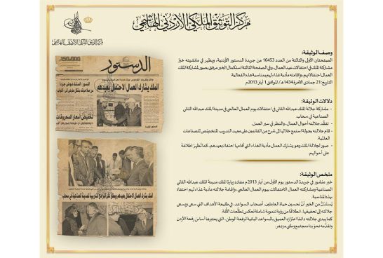 نشر مركز التوثيق الملكي الأردني الهاشمي بمناسبة يوم العمال، الذي يصادف اليوم، الأول من أيار، في الصفحتين الأولى والثالثة من العدد ١٦٤٥٣ من جريدة الدستور الأردنيَّة الصادر بتاريخ الأول من أيار ٢٠١٣، خبرًا يظهر في المانشيت الرئيس مفاده مشاركة الملك عبدالله الثاني ابن الحسين في احتفالات عيد العمال.