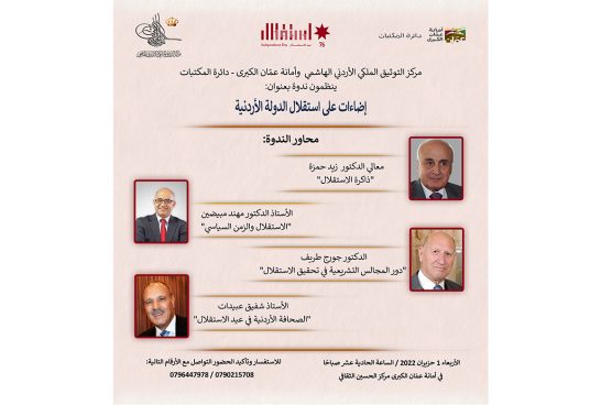 تحت رعاية أمين عام وزارة الثقافة عطوفة الأستاذ هزاع البراري، وبمناسبة احتفالات المملكة بعيد الاستقلال، ينظم مركز التوثيق الملكي الأردني الهاشمي وبالتعاون مع دائرة المكتبات في أمانة عمان الكبرى ندوة بعنوان: إضاءات على استقلال الدولة الأردنية، وذلك يوم الأربعاء الموافق الأول من حزيران 2022م، الساعة الحادية عشر صباحًا في أمانة عمان الكبرى مركز الحسين الثقافي، وستكون محاور الندوة كالتالي: _ معالي الدكتور زيد حمزة: "ذاكرة الاستقلال" _ عطوفة الأستاذ الدكتور مهند مبيضين: "الاستقلال والزمن السياسي" _ الدكتور جورج طريف: "دور المجالس التشريعية في تحقيق الاستقلال" _ الأستاذ شفيق عبيدات: "الصحافة الأردنية في عيد الاستقلال"