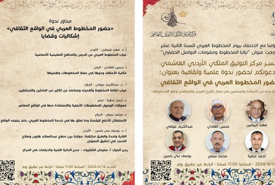 تزامنًا مع الاحتفاء العالمي بيوم المخطوط العربي للسنة الثانية عشر وتحت عنوان " تراثنا المخطوط ومقومات التواصل ومقومات التواصل الحضاري"، عقد مركز التوثيق الملكي الأردني الهاشمي ندوة علمية ثقافية بعنوان: حضور المخطوط العربي في الواقع الثقافي، إشكاليات وقضايا، يوم الأحد الموافق الرابع عشر من نيسان 2024 من الساعة الحادية عشر إلى الساعة الواحدة ظهرًا بتوقيت عمّان عبر تقنية الاتصال عن بعد، وبمشاركة نخبة من الأساتذة المختصين في مجال التاريخ العربي والإسلامي وعلم المخطوطات.