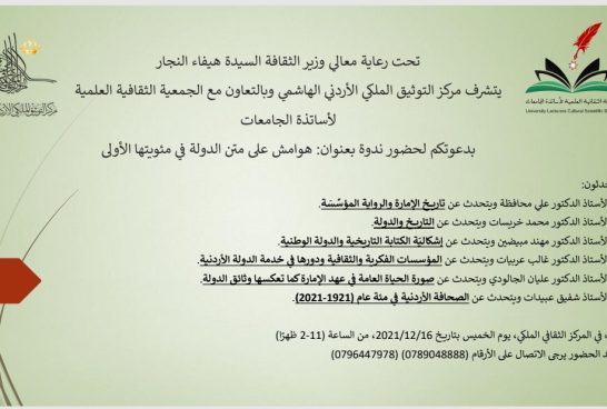 تحت رعاية معالي وزير الثقافة هيفاء النجار يتشرف مركز التوثيق الملكي الأردني الهاشمي وبالتعاون مع الجمعية الثقافية العلمية لأساتذة الجامعات بدعوتكم لحضور ندوة بعنوان: هوامش على متن الدولة في مئويتها الأولى.